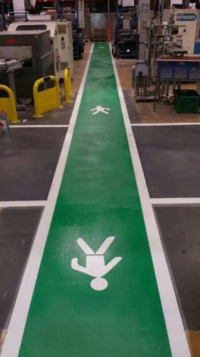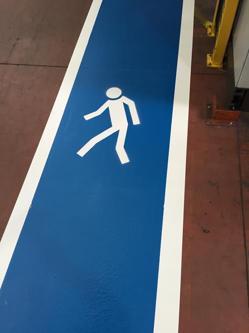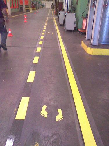 Wir stellen her: Fahrwege, Fluchtwege, Gehwege, Zebrastreifen, Symbole (Laufendes Männchen, Gabelstapler, Fußabdruck, Richtungspfeil etc.), Sperrflächen, Leitlinien, Palettenstellflächen, Stellplätze für PKW, LKW, Abstellflächen, Wartespuren, Beschriftung und Beschilderung.